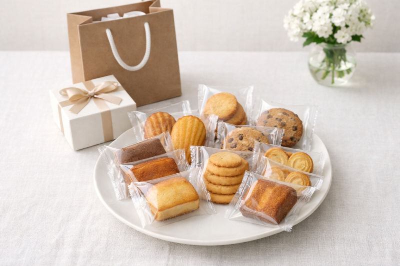 迷ったら、個包装の焼き菓子+米菓の2点にしておくと、金額も調整しやすいです。