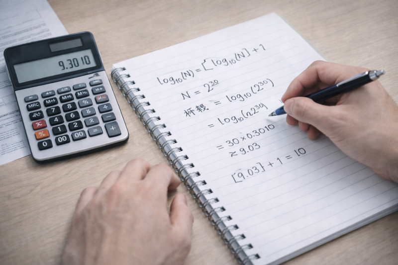 - log10は巨大な数の桁数判定に便利だが、境界付近は誤差に注意する。