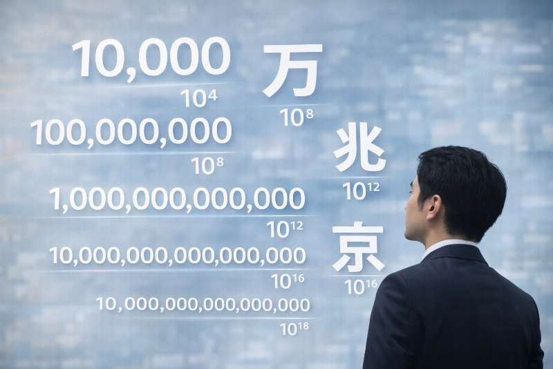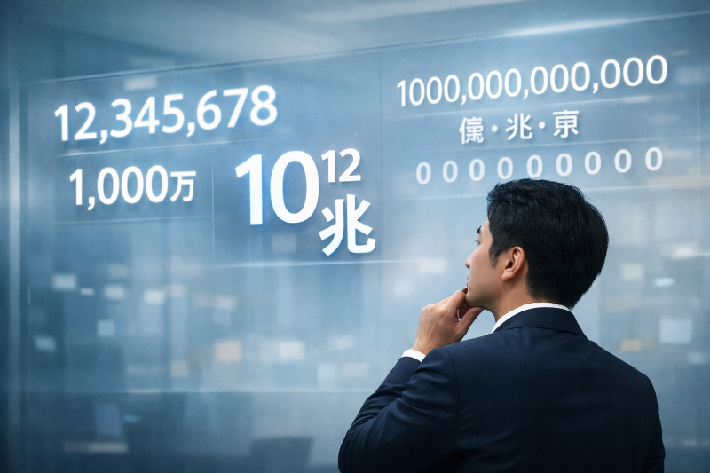 たとえば兆は「0が12個」のように覚えがちですが、実際は10の12乗なので、表記や区切りとセットで理解するのが安全です。