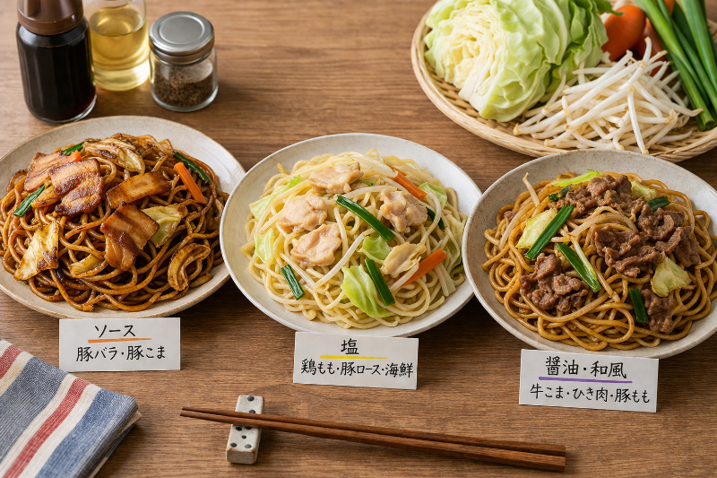 同じ焼きそばでも、お肉が変わるだけで「香ばしさ」や「満足感」がふわっと変わります。