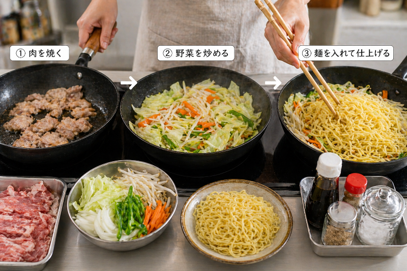 | 水分を出さない | べちゃっとしにくく、麺がほぐれやすい | 野菜は入れすぎず、強めの火で短時間 |
