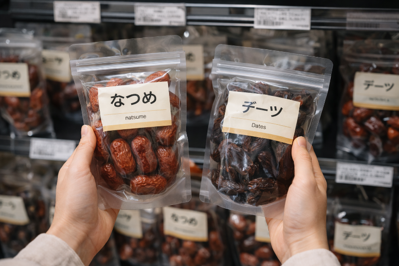 棗は「なつめ」「棗」と表記されることが多く、デーツは「デーツ」や「なつめやしの実」と記載されています。