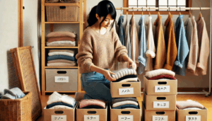 - 秋・冬物:かさばるニットやコートは圧縮袋を活用。型崩れ防止にはハンガー掛け収納がベスト。