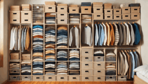 - 春・夏物:通気性の良い場所に吊るす。Tシャツやブラウスは畳まず収納ケースに立てて入れると取り出しやすい。
