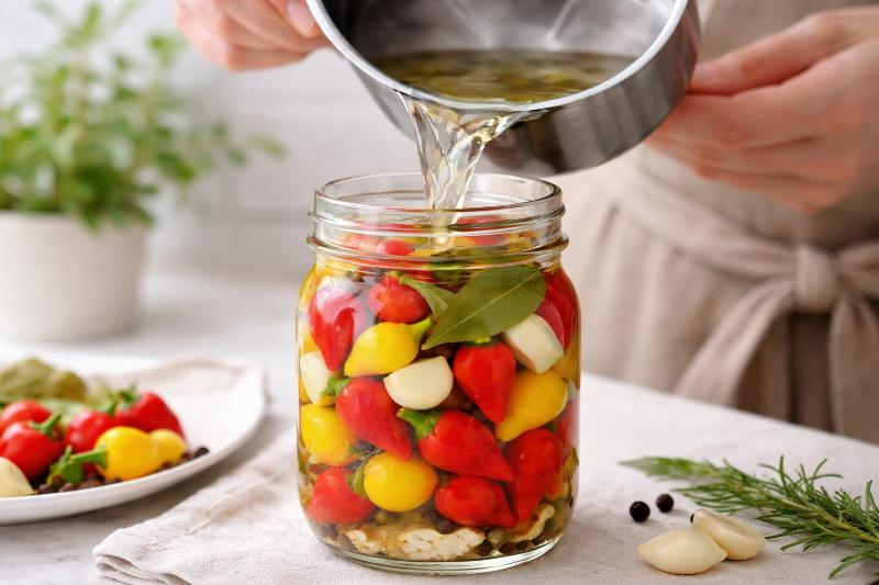 消毒した瓶にビキーニョとにんにくを入れ、熱いうちにピクルス液を注ぎます。